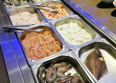 Le second met à votre disposition des aliments crus qui seront saisis au wok devant vous et dont vous pourrez accompagner d’une sauce de votre choix.
